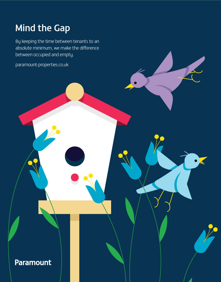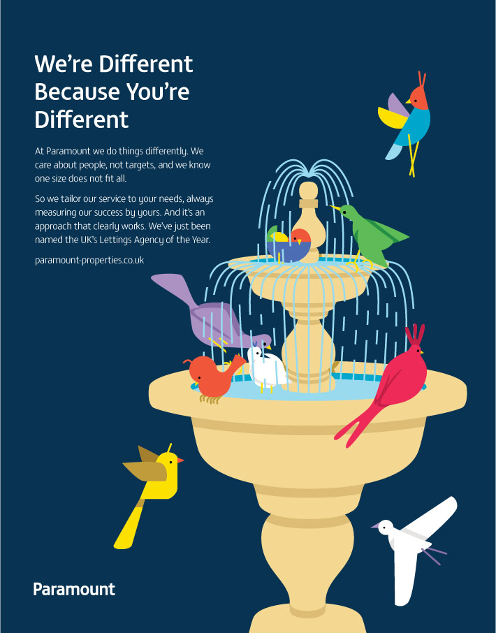 It was important to differentiate Paramount not only in terms of its proposition but also in its visibility within a very crowded market. Combining a vibrant graphic language with humanist typography, we developed an identity that works effectively across media and in all environments. The bespoke word mark features a 6º angle that recurs throughout, enabling dynamic use of a bold colour palette. Specially commissioned photography highlights Paramount’s local area of North West London and reflects their unparalleled market knowledge. Illustrations by the distinctive and playful Kiki Ljung add an unconventional and very human touch.
